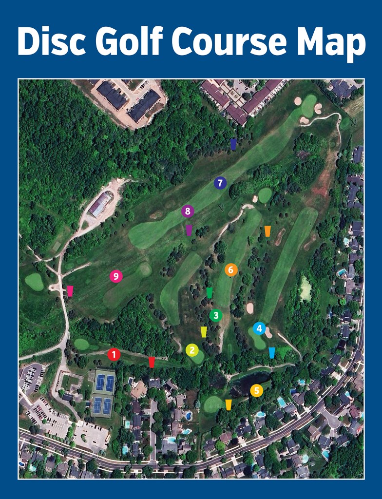 To access the disc golf course, please enter from the Tennis Club parking lot and use the map below.